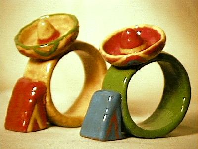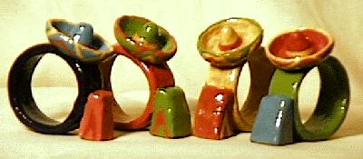 Each ring is glazed in solid colors with detailed accents. They are sold in sets of four. Click for detail of left. || Click for detail of right.